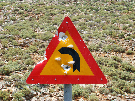 tego specyficzne obrazki – stojące przy szosie znaki drogowe są pełne dziur od