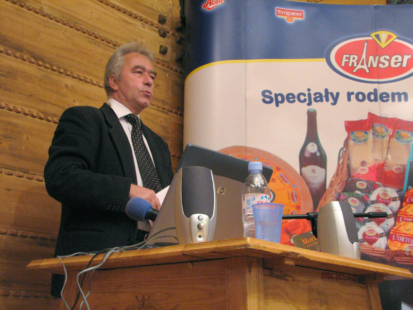 Maciej Pinkwart zaprezentował wykład "Symboliczny Paryż". Jednym z symboli była... woda mineralna "Evian", wspomagająca go podczas wykładu.