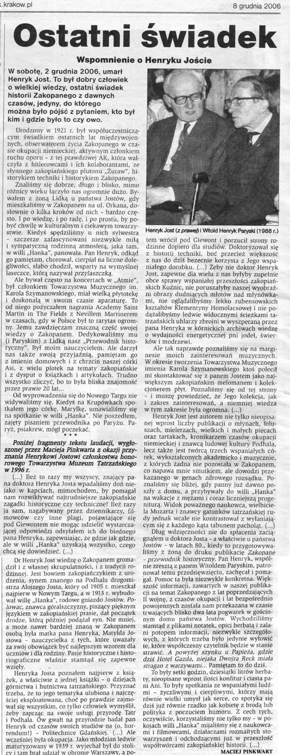 Artyku³ w Dzienniku Polskim (Dziennik Podhalañski) 8 grudnia 2006