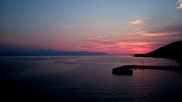 W Lutraki jesteśmy po siódmej wieczór. Po bulwarze przechadza się już niewielu gości, pan na keyboardzie gra znowu i znowu na smutno. Słońce zachodzi wciąż jeszcze o dziewiątej - to kolejny z dni, w których lato, które dopiero co przyszło, nie umie się jeszcze zdecydować, czy już zacząć skracać dzień, czy zrobić to dopiero za dzień - dwa. Pakujemy się, nastawiamy budziki na trzecią w nocy i otwieramy ostatnie wino - znów jest to doskonały grecki syriah.