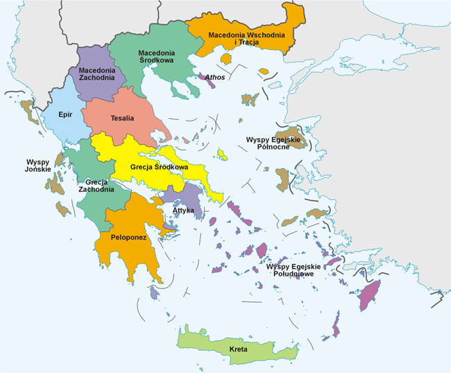 Wjeżdżamy na Peloponez. Początkowo krajobraz się nie zmienia, ale podświadomie czujemy, że jesteśmy w trochę innym świecie, świecie południa, palm, ciepłego wiatru i wielkich przestrzeni, których w Attyce nie widywaliśmy. No właśnie, Attyka. Nazwy bywają zwodnicze. Współczesne podstawowe jednostki administracyjne wywodzą się z dawnych krain historyczno-geograficznych, mają zwykle takie same nazwy, ale już terytorium tylko zbliżone. Dawne krainy, to zwykle w mniejszym czy większym stopniu pozostałości dawnych państw, rządzonych niegdyś przez królów, tyranów czy naczelnych wodzów, często zajmujące rozległe równiny, rozdzielone wysokimi pasmami górskimi. Najważniejszymi z nich były na północy Macedonia, Tesalia i Epir, w środkowej części - Etolia, Fokida, Beocja, Eubea i Attyka, a na Peloponezie była to Elida, Achaja, Argolida, Arkadia, Lakonia i Messenia. Osobnymi krainami były wyspy: Kreta i archipelagi Dodekanez, Cyklady, Sporady. Obecnie podział obejmuje siedem administracji (Attyka, Epir-Macedonia Zachodnia, Macedonia-Tracja, Tesalia-Grecja Środkowa, Peloponez-Grecja Zachodnia-Wyspy Jońskie, Kreta, Wyspy Egejskie), w obrębie których jest trzynaście regionów (zwykle nazywanych nadal po staremu nomosami lub prefekturami: Attyka, Grecja Środkowa, Grecja Zachodnia, Kreta, Wyspy Jońskie, Wyspy Egejskie Północne, Wyspy Egejskie Południowe, Epir, Tesalia, Macedonia Zachodnia, Macedonia Środkowa, Macedonia Wschodnia i Tracja, Peloponez, oraz - dodatkowo - Autonomiczna Republika Góry Atos.