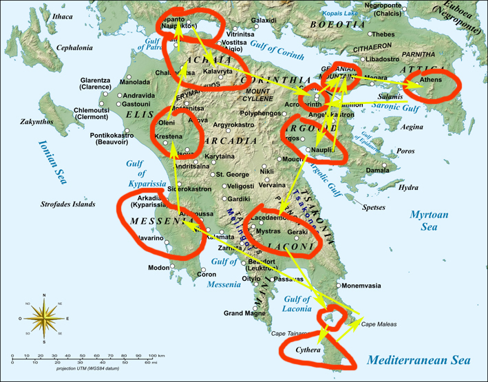 Peloponezu przylegała Zatoka Koryncka, od wschodu oblewało go Morze Egejskie -
