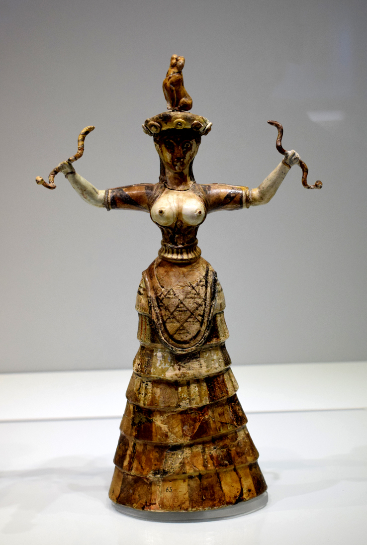 przez byka, wężową boginię z pięknymi piersiami na wierzchu, długowłosych