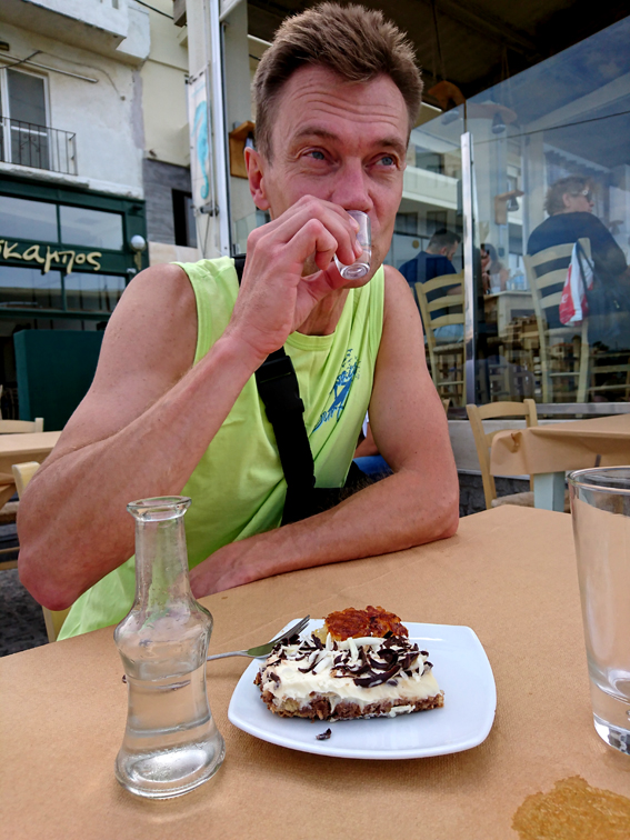 Restauracja ma trzy części - jedna osłonięta nad morzem, druga - na świeżym powietrzu, też nad morzem, trzecia - a właściwie pierwsza - po drugiej stronie ulicy. Kelnerzy niosący tace lawirują między samochodami, nikomu to nie przeszkadza, przynajmniej nikt tego nie okazuje. Przy stolikach towarzystwo międzynarodowe, ale większość stanowią Grecy.