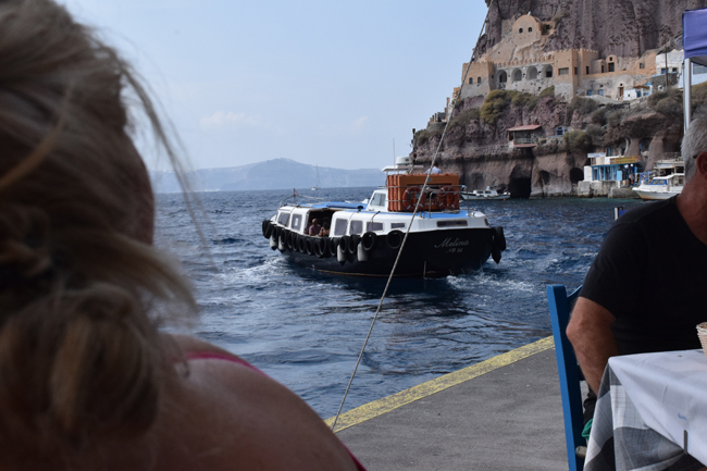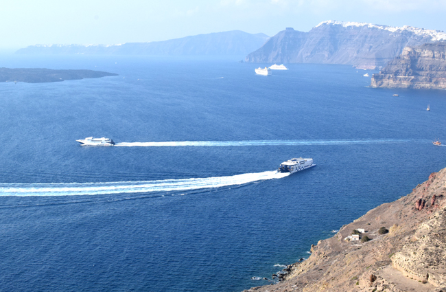 dwie godziny później już widać Santorini i deszcz chowa się gdzieś w morzu.