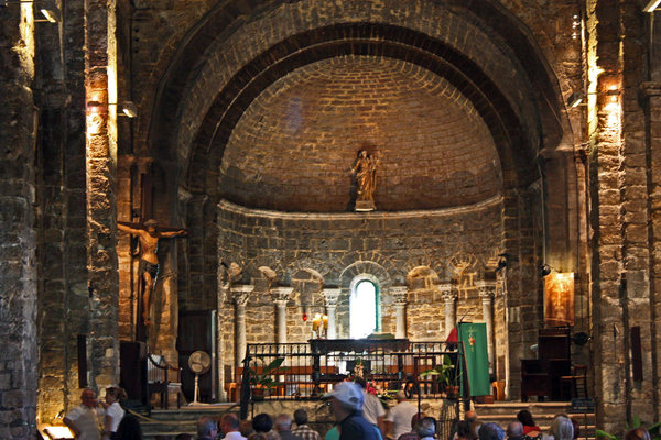 Imponujące prezbiterium kościoła Notre-Dame-de-la-Mer ozdobione jest dość skromnie wyglądającą i mało widoczną figurą Madonny z Dzieciątkiem. Ołtarza tradycyjnego w zasadzie nie ma.