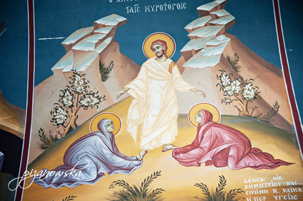 dość skromny ikonostas, za to freski z ikonami na bocznych ścianach tak