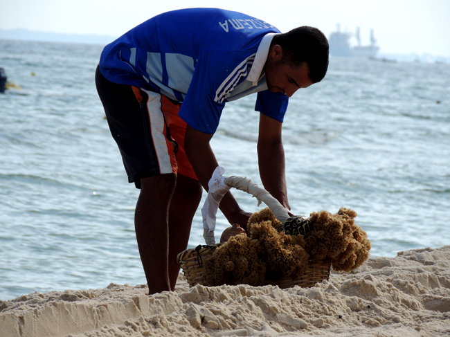 Pan od gąbek sprzedawał też skorupy żółwi, wielkie muszle maxi winniczków po 30 cm średnicy i rozgwiazdy |