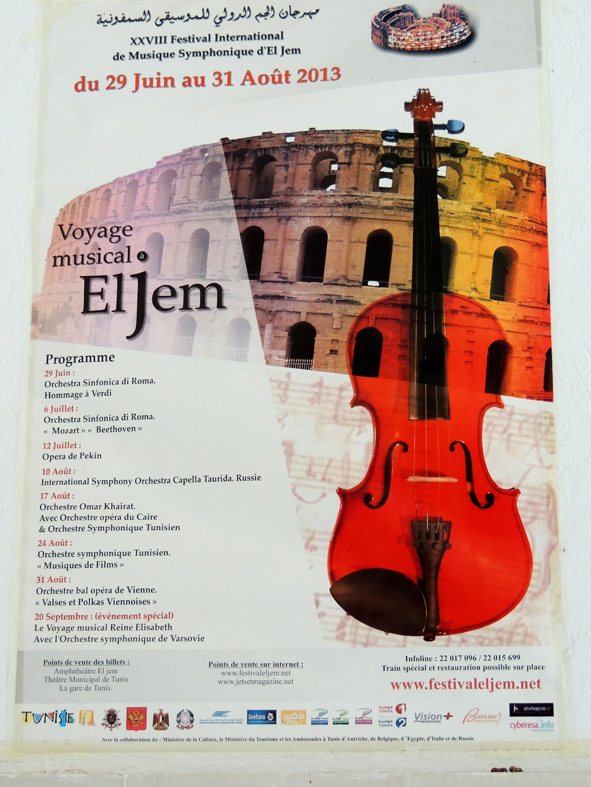 Plakat letniego festiwalu muzycznego w El Jem. We wrześniu występowała "Orkiestra Symfoniczna z Warszawy" - nie podali jaka... |