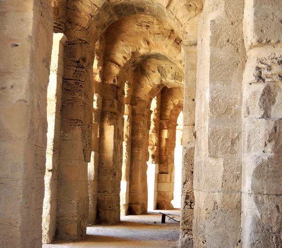 Wstęp jest płatny (bilet łączony do amfiteatru, nazywanego tu z pewną przesadą Koloseum, oraz do muzeum archeologicznego), ale warto spędzić tam z godzinę, łażąc po arenie (elipsa 149 x 124 m), kilku piętrach ław dla publiczności (36 metrów wysokości), oglądając zaplecze. Wyobrażałem sobie, jak w czasach podboju arabskiego broniła się tu ostatnia władczyni pobliskiego państwa berberyjskiego, 30-letnia królowa Kahena Dihya, która tutaj broniła się przed Arabami przez 4 lata, aż wreszcie została zabita przez własnego kochanka, który jej głowę zaniósł wrogom... A dziś odbywają się tu występy artystyczne, festiwale muzyczne i koncerty muzyki poważnej. Zwiedzałem rzymskie Koloseum, amfiteatry w Weronie, Arles i Orange, ale ten tutaj, będący największym i najlepiej zachowanym zabytkiem rzymskim w Afryce, podoba mi się zdecydowanie najbardziej. Zastanawiam się tylko nad tym, skąd oni tu, na takim afrykańskim za...tybrzu wzięli nie tylko 40 tysięcy widzów, ale tę całą obsługę, gladiatorów i dzikie zwierzęta? No te ostatnie, to w Afryce bułka z masłem... Czy kiedykolwiek było dla kogo robić takie igrzyska, zakładając że chleb już mieli wcześniej? Co więcej, jakby im jednego Koloseum było mało, to zbudowali sobie jeszcze dwa inne teatry, mniejsze (na 6 i 7 tys. widzów). Owszem, było Thysdrus tętniącą życiem stolicą prowincji, ze sporą liczbą arystokracji (o czym świadczą ruiny luksusowych rezydencji patrycjuszowskich), ba - nawet było uzurpatorską, ale jednak stolicą cesarstwa, kiedy to afrykańska prowincja w 238 roku zbuntowała się przeciw rzymskiemu cesarzowi Maksyminowi Trakowi i obrała niezależnym cesarzem prokonsula Gordianusa. Ten wybór przyjął, ale zdając sobie sprawę ze swego wieku współrządzącym ustanowił swego syna Gordianusa II. Junior stanął na czele wojsk afrykańskich, walczył z legiami rzymskimi w Kartaginie - i tam poległ po miesiącu od zamachu stanu. 30 dni później jego ojciec popełnił samobójstwo i w sumie po dwóch miesiącach Afryka wróciła pod skrzydła Rzymu, a dzisiejszy El Jem stracił stołeczność na zawsze i bez szans na restytucję.