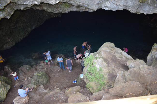 odważniejsi turyści, którzy po skałach zeszli kilkanaście metrów w głąb jaskini.