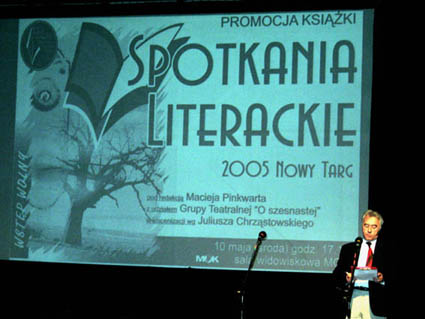 Wczoraj w sali teatralnej Miejskiego Ośrodka Kultury w Nowym Targu odbyła się promocja drugiego już tomu "Spotkań literackich" - wierszy i opowiadań, powstałych podczas warsztatów, prowadzonych przeze mnie w Nowym Targu, a także napisanych przez osoby z którymi mam kontakt internetowy lub listowy, spoza Nowego Targu. Uroczystość była na dużą skalę, dyrekcja MOK zorganizowała to bardzo pięknie - grali i śpiewali młodzi górale z zespołu "Mali Hyrni", uczestnicy Warsztatów Teatralnych MOK zaprezentowali w ciekawej inscenizacji fragmenty tekstów wszystkich autorów, były przemówienia, kwiaty no i można było kupić ładnie wydane te nasze książki. Usłyszałem wiele ogromnie miłych słów i podziękowań, na pewno nie zasłużyłem na aż takie fetowanie - nie jestem przyzwyczajony, bo tu mieszkam dopiero pięć lat i tylko prowadzę te warsztaty i wydałem tylko dwa roczniki utworów literackich, a w Zakopanem lat 26 i kilkadziesiąt książek a w efekcie - szkoda gadać. Tak więc - dziękuję Nowotarżanom! Wygłosiłem takie krótkie przemówienie o roli literatury i naszych działaniach, taki wykład inauguracyjny, tekst tutaj. Po promocji było spotkanie przy winku i ciasteczkach w Sali Regionalnej MOK-u, bardzo miłe, serwis zdjęciowy na nowym aparacie robiła Lidka. Wiesław Piechocki wrócił z wiosennej podróży do Ziemi Świętej i jego teksty znów zagościły na mojej stronie.