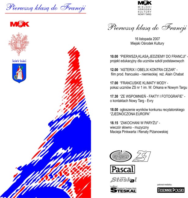 16 listopada 2007 w Miejskim Ośrodku Kultury w Nowym Targu, dzięki inicjatywie Renaty Piżanowskiej i jej staraniem odbył się Dzień Kultury Francuskiej. Rano Francji uczyły się - poprzez twórczość - dzieci z pierwszy klas dwóch nowotarskich szkół (Zajęcia prowadziły Nina Kaszuba i Renata Piżanowska), potem był dla nich film o Asteriksie i Obeliksie, po południu odbył się pokaz mody inspirowanej klimatami francuskimi przygotowany pod kierunkiem prof. Marceli Pietrzyk przez nauczycielki i uczennice Zespołu Szkół nr 1, potem słuchaliśmy wspomnień Marii Giłki i Jana Nowinowskiego o kontaktach Nowego Targu z podparyskim Evry oraz uczestniczyliśmy we wręczaniu nagród w konkursie recytatorskim "Wspólna Europa", w którym zwyciężyła uczennica z Liceum Goszczyńskiego Ania Kasprzycka, recytująca po francusku wiersz Jacquesa Préverta. Na zakończenie mieliśmy z Renatą wspólny wieczór autorski, na którym przedstawialiśmy fragmenty przewodnika ilustrowanego (zdjęcia Renaty) po Paryżu, przeplatane jej wierszami (TUTAJ teksty). Był też na koniec mój autorski przekład piosenki Charlesa Treneta "La Romance de Paris", noszący tytuł "Zakochani w Paryżu" - TUTAJ tekst polski, TUTAJ nuty. TUTAJ zdjęcia z całej imprezy.