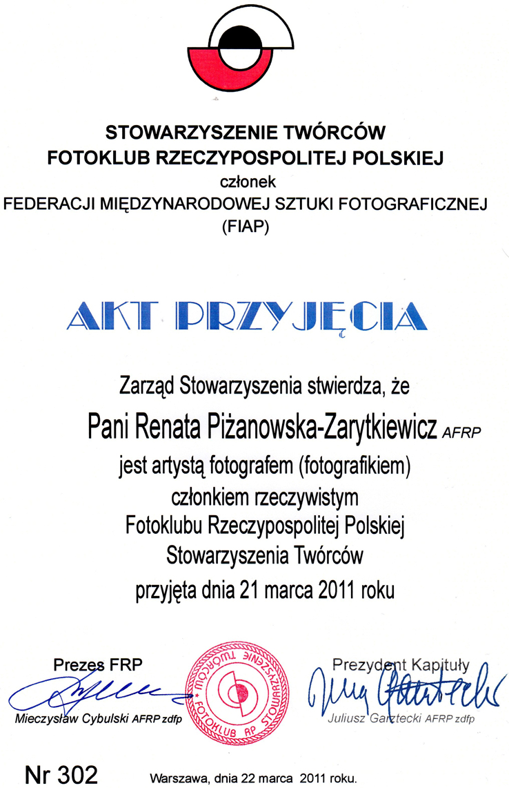 Wiosna zaczęła się tym, że przyjęli Renatę do stowarzyszenia artystów fotografików, na dowód czego otrzymała niniejszy akt. Zamieszczam więc akt Renatki z tym większą satysfakcją, że wydarzenie to stanowi na pewno jej kolejne wielkie osiągnięcie, co mnie cieszy. Gratulacje!