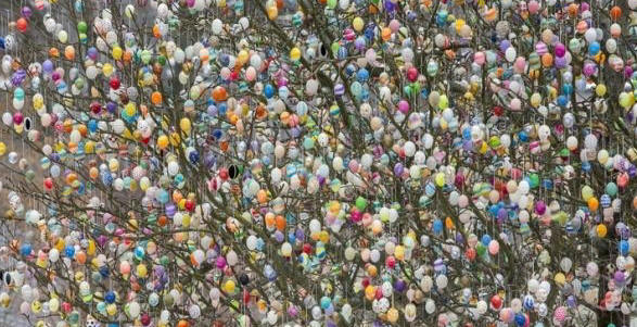 Pisanki na choinkach. Na Podhalu pada śnieg, a