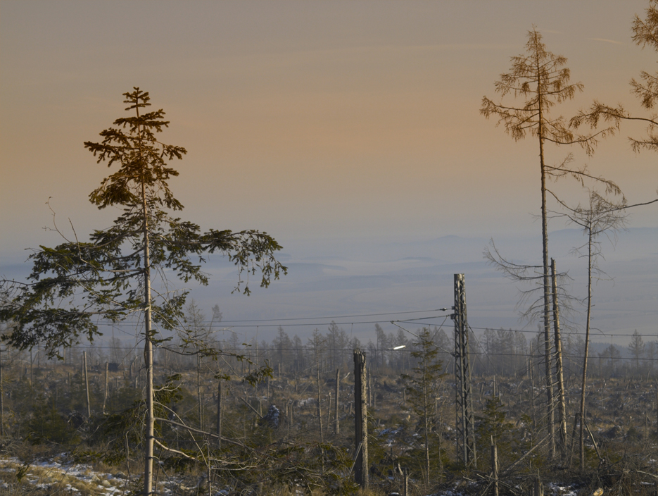 Na południe od Tatrzańskiej Polanki - jeszcze widoczne spustoszenie po huraganie z 2004 r. Dalej - mgła nad Spiszem