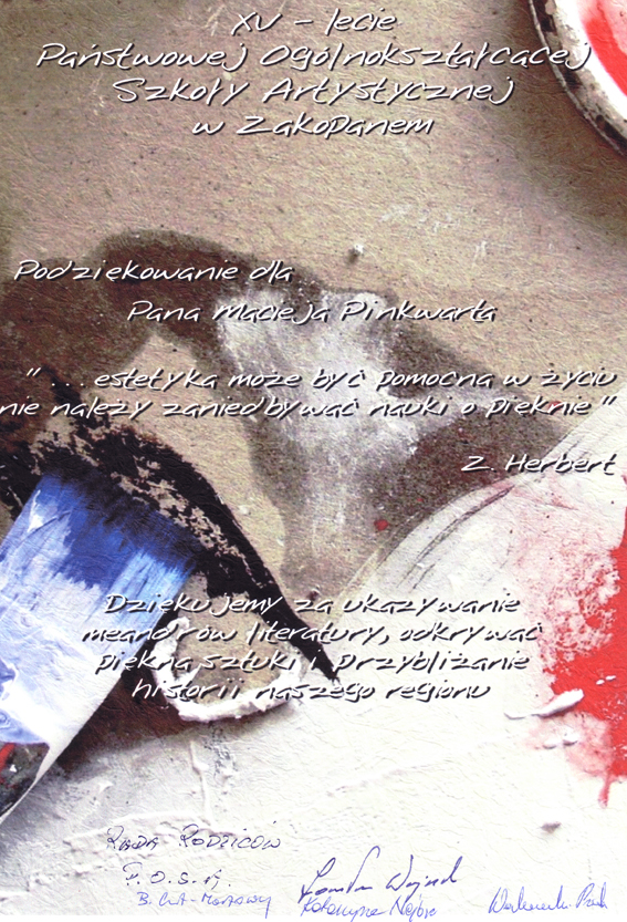 Dyplom Rady Rodziców POSA, przyznany mi z okazji jubileuszu 15-lecia Szkoły Artystycznej